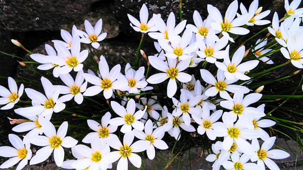 毎年夏から初秋に雨が続くと、ギャラリーの庭にタマスダレという花が一斉に咲き始めます。9月13日の誕生花にもなっているこの花は、一輪でも十分美しいのですがまとまって咲いているのを見るととても涼しげで上品です。種は1つの花で3つの部屋に分かれて入っていて、1つの花で15個ほどの種ができています。カマキリの顔のような形をしています。自然落下したこぼれ種は、2〜3年すると花を咲かせるようです。