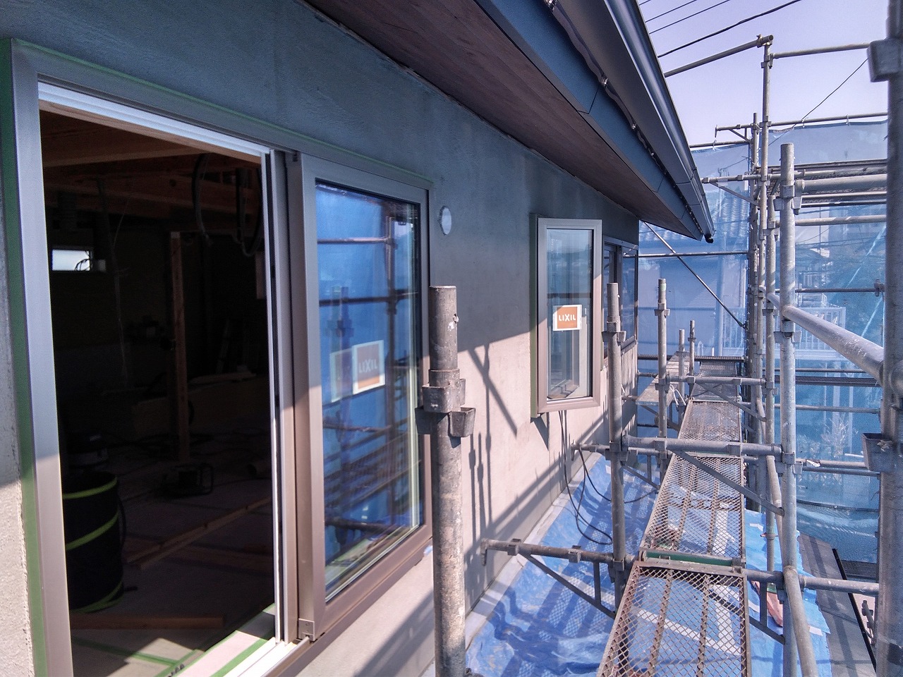↓外部はリシン掻き落としの下塗りが完了し、養生中です。