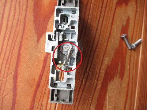 このように外れています。このバネをレバーの部分の突起部に引っ掛けて完了です。