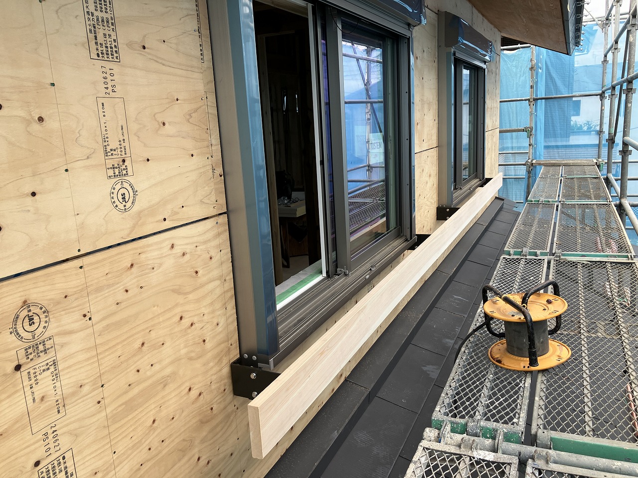 8月の一番暑い時期に建て方作業をしたN様邸はちょうど木工事が半分完了したところです。今日は大工さんと一緒に2F南側サッシに取り付ける布団干しを施工してきました。木材の長さが5mで持ち運びが大変でしたが、無事に設置できました。
