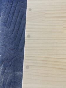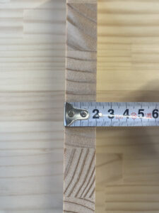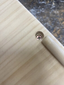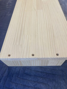 続いて足を取り付けていきます。厚みが20㎜なのでビスがはみ出ないようにいい感じの位置に穴をあけます。この穴をあけることによってビスの頭を隠すことができるので完成した時の見た目がきれいになります。