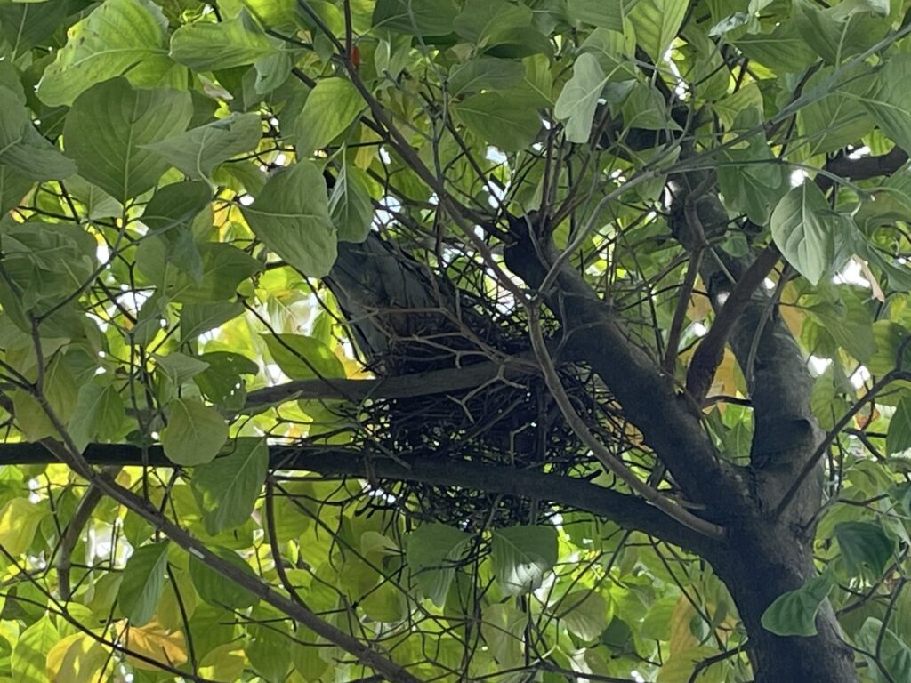まだ猛暑が残る先日のこと、お隣のエコショップの玄関前の木にできた鳥の巣を見つけました。