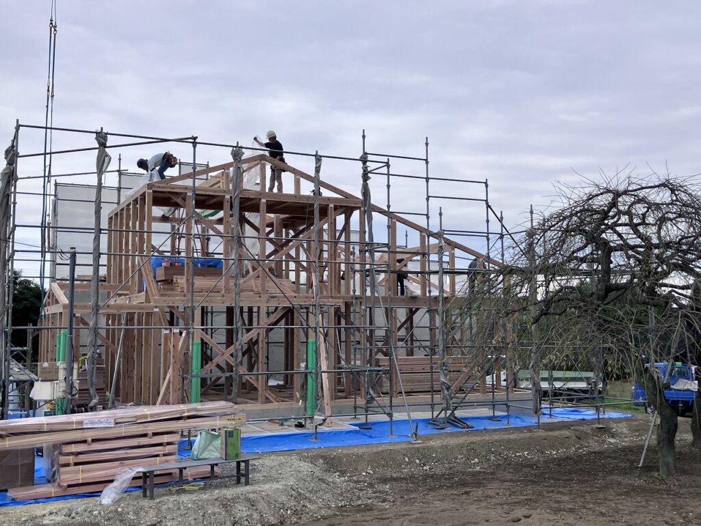 10月も半ば過ぎで、紅葉も見頃になってきたかと思います。全国的に平年並みか、平年より遅くなる見込みらしいです。夏場に活躍した空調服と半袖シャツもそろそろ衣替えで長袖になるころでしょうか?気温も20℃に届かない日も多くなり、秋から冬へ向かって季節が変わっていくのを実感できます。今週と来週は建て方作業が続いていきます。本日は寄居町T様邸、先週は雨予報でしたが、なんとか曇り空で雨が降ることなく、1日目の作業が完了しました。