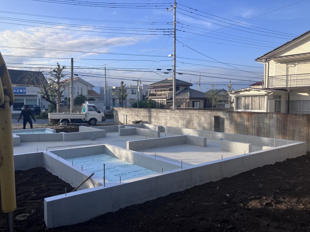 来週は南北に流れる大屋根の家。基礎工事が完了し、今週末から大工さんが土台敷きを行う予定です。後は天気が悪くならないように祈るのみです。