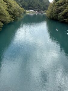 ダムを進んでいくと真っ青な四万湖がみえてきま
