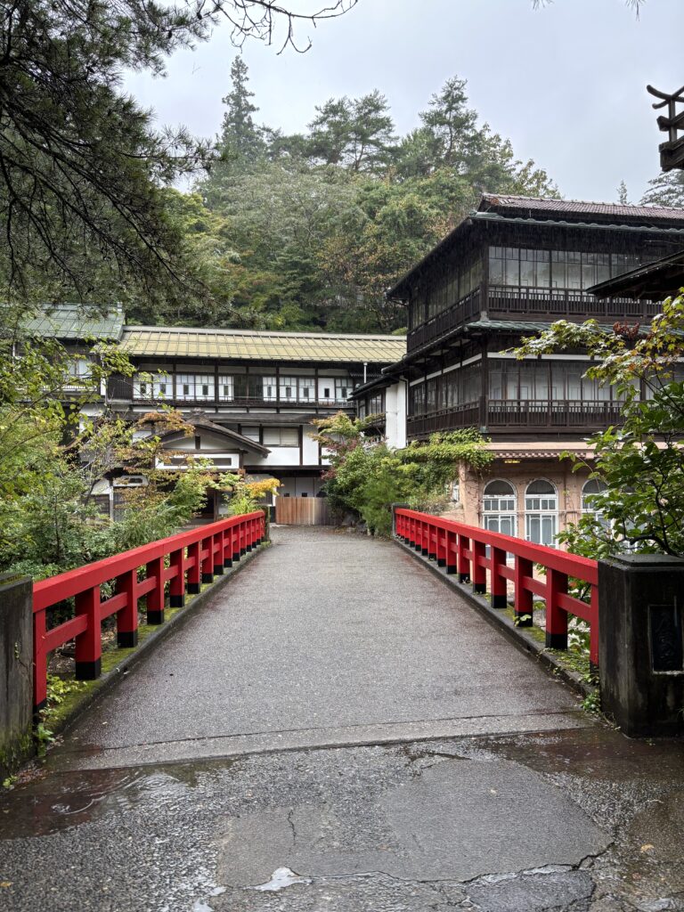 今回はこちらの温泉街にある積善館が一番の目的です。「千と千尋の神隠し」の舞台のひとつとして有名な建物です。