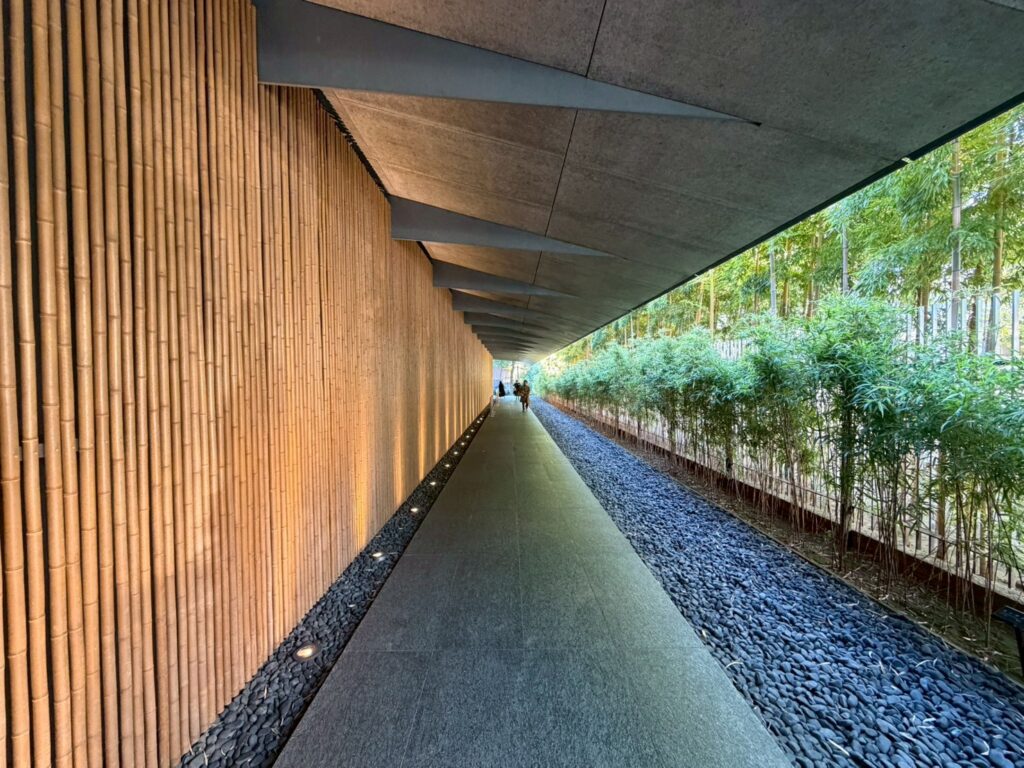 入口までのアプローチには深い軒がかかっており、竹を貼った外壁とアプローチ沿いに植えられた竹との間を歩きながら建物に入ります。
