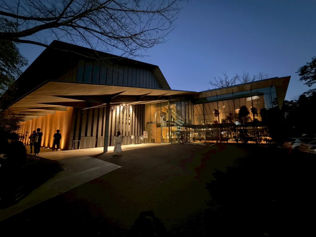 展示を見て外に出るころには日が暮れていたのですが、暗くなってからの外観もとても印象的な美術館でした。