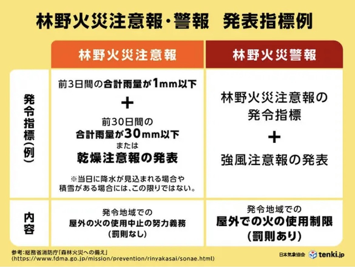 注意報発令の基準は各自治体にもよりますが、直前3日間の合計降水量が少ない時または乾燥注意報が発表されている時です。 これらに加えて、強風注意報が発表されると林野火災警報が発表されます。