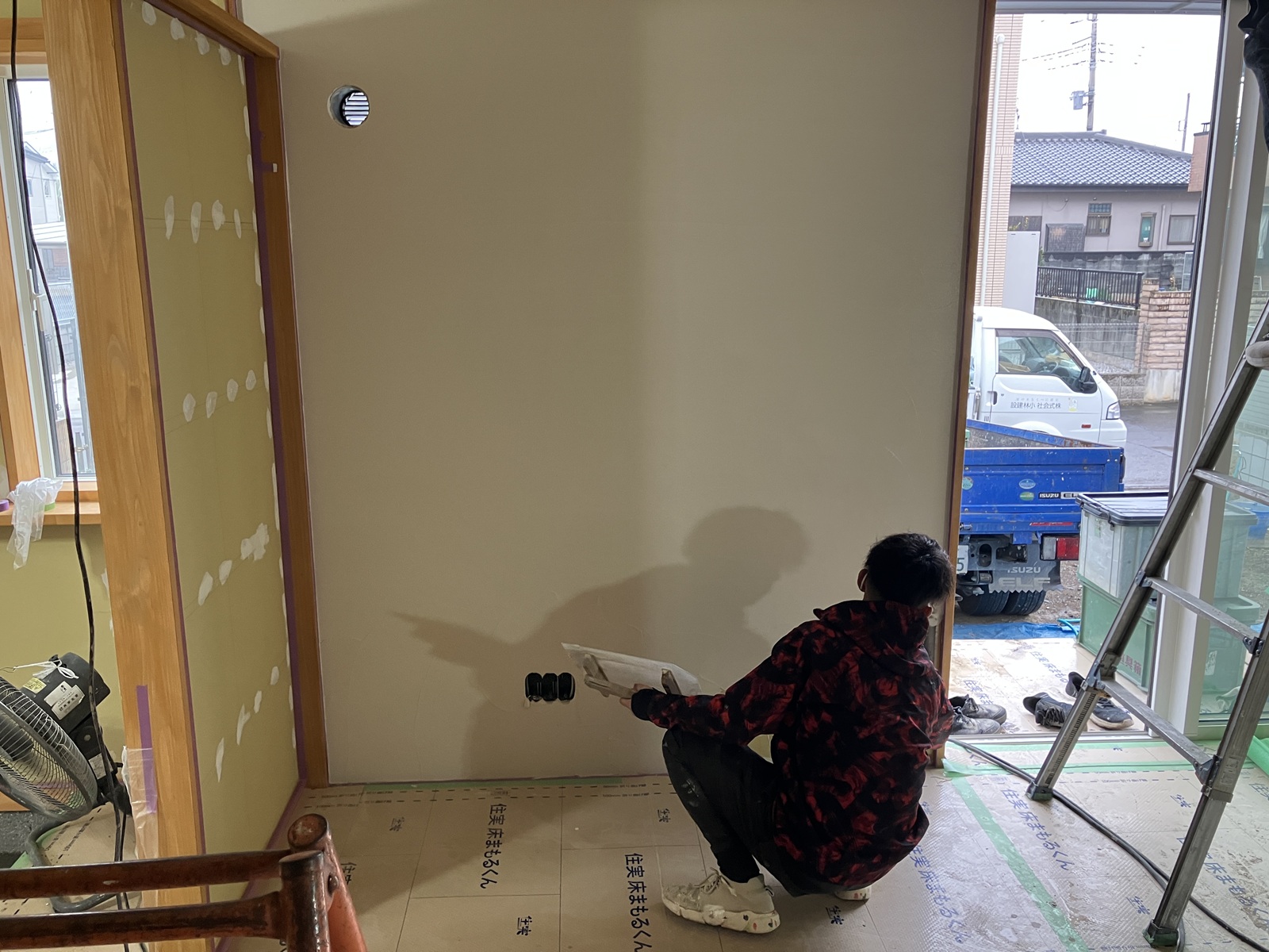 こちらでは壁の珪藻土を施工している最中でした。