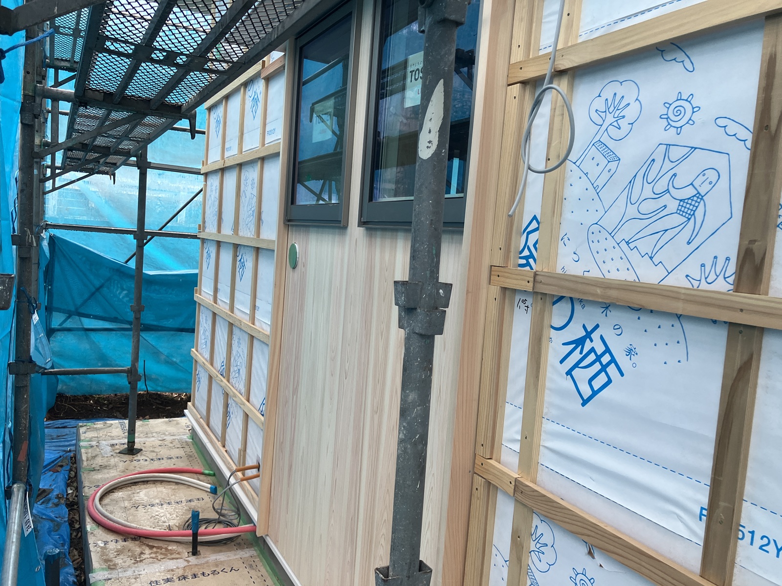 大工さんは造作加工で不在でしたが、外壁縁甲板を施工している途中でした。