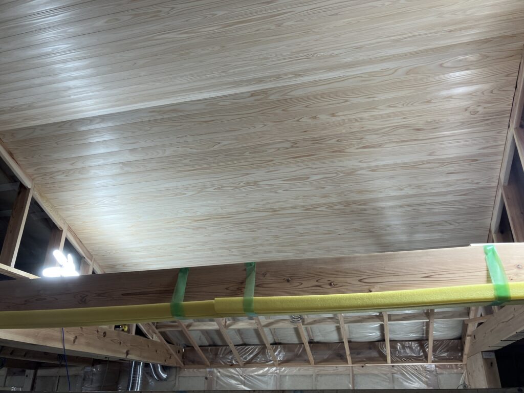 こちらでは大工さんが内部天井の羽目板を施工している最中でした。