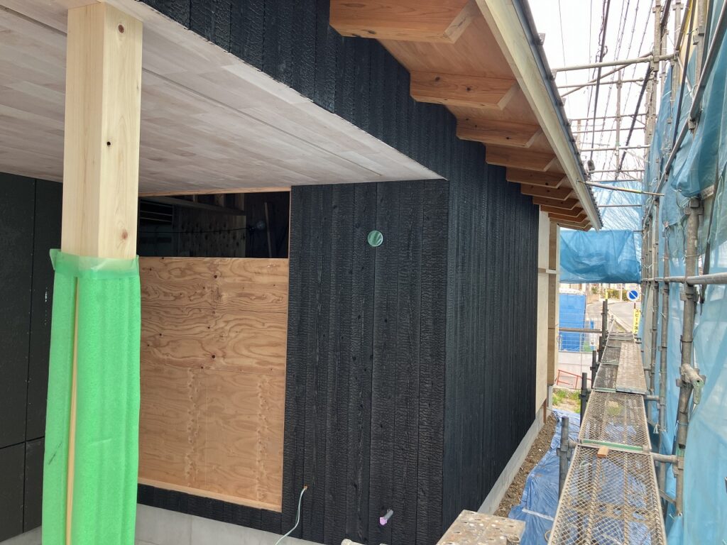 今回外壁の一部に焼杉(やきすぎ)を施工しています。