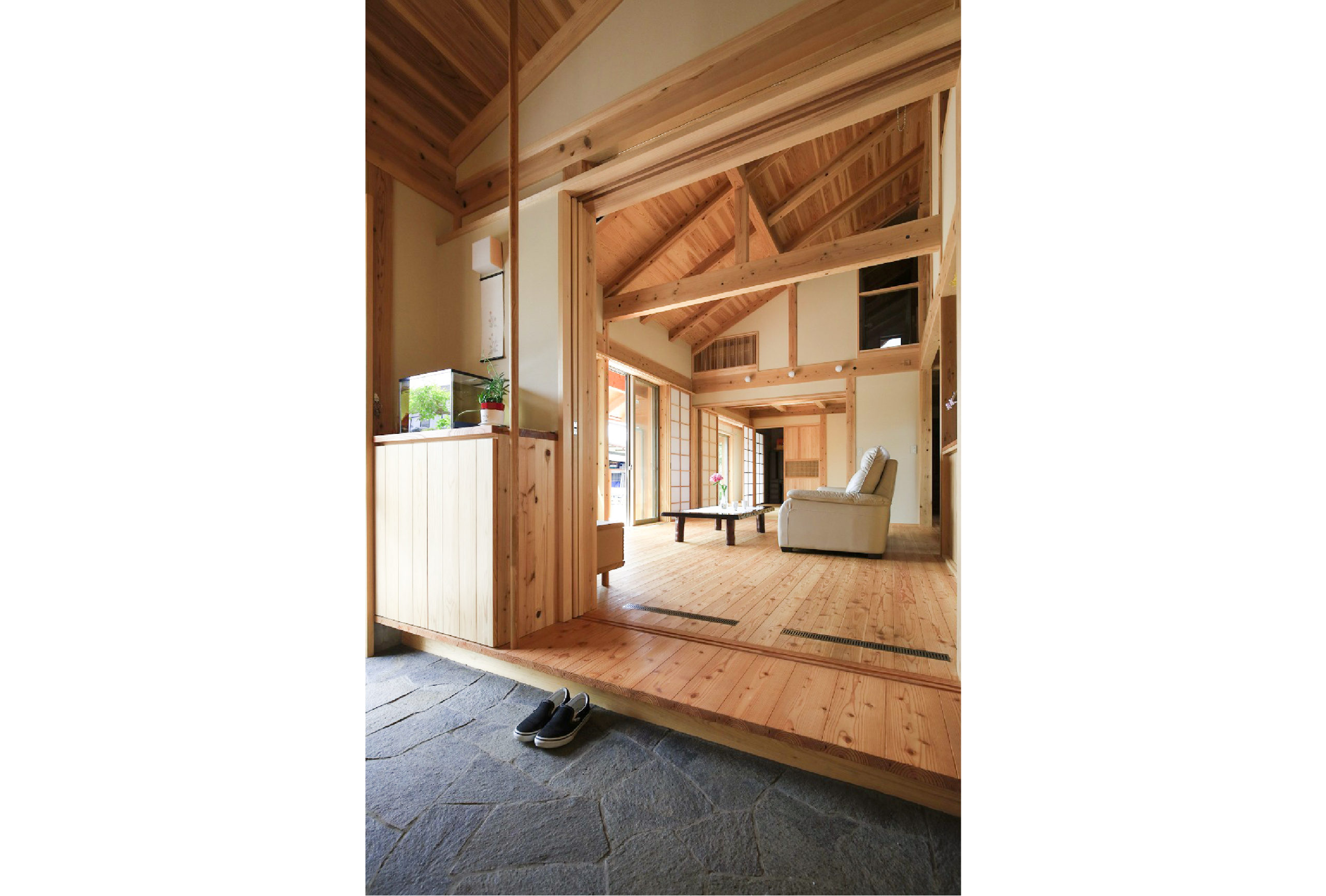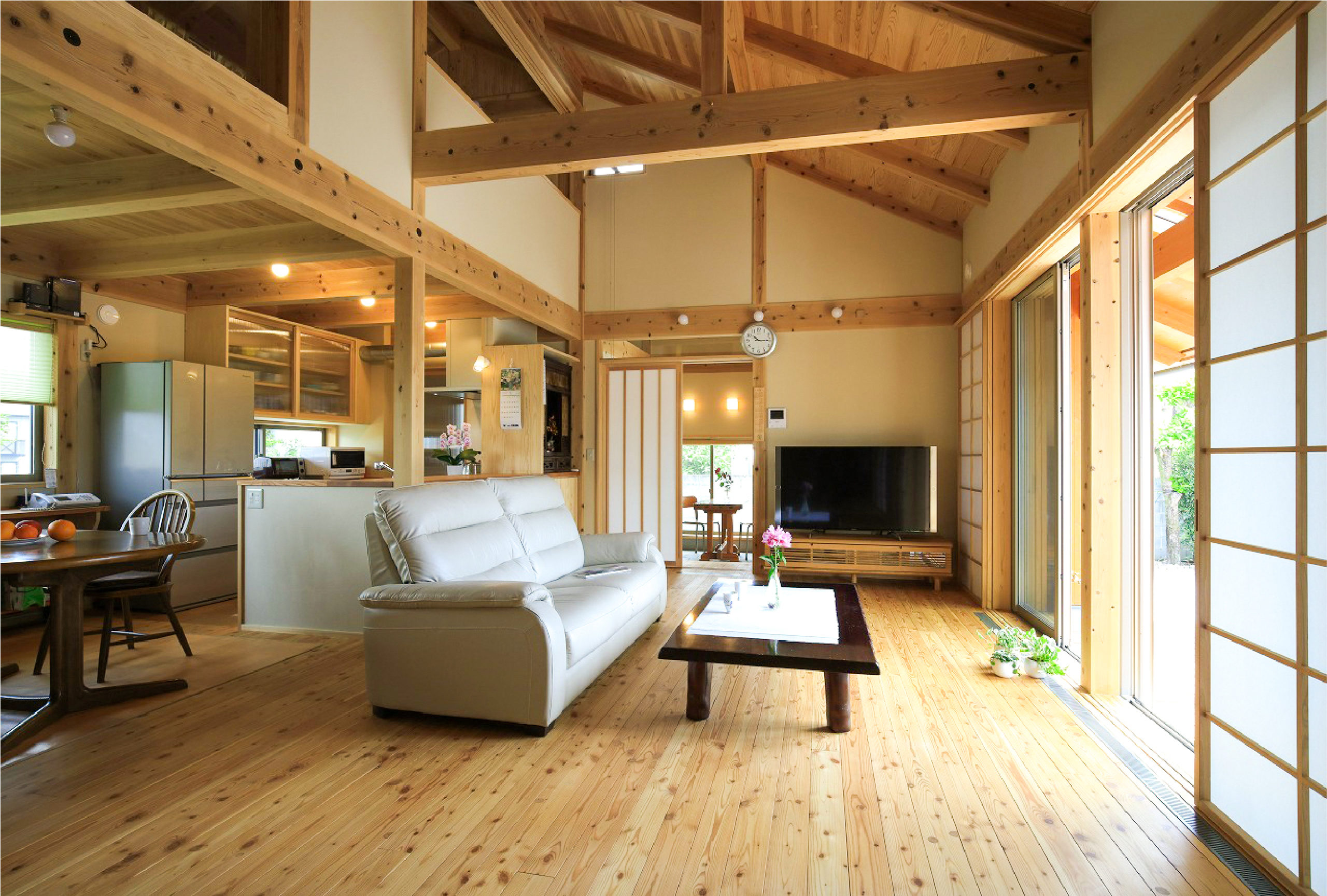 木組みの空間に吹抜けのあるリビング