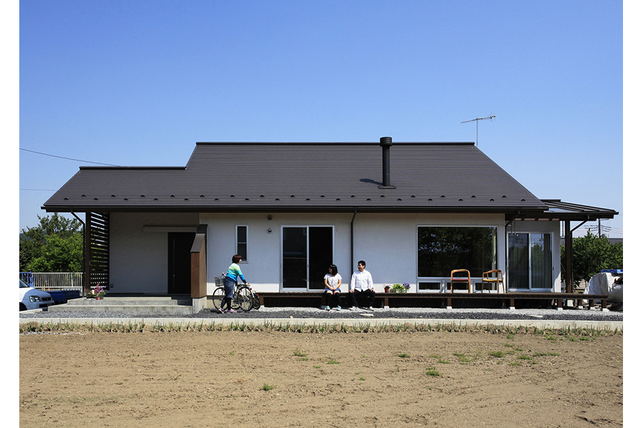 南に葺かれた大屋根と真っ白な塗り壁のコントラストが美しい外観のお住まい。夏はエアコンに頼らず暮らしていきたいと、日射遮蔽や風通しを工夫し、永く快適に家族が過ごすための間取りにこだわりました。