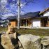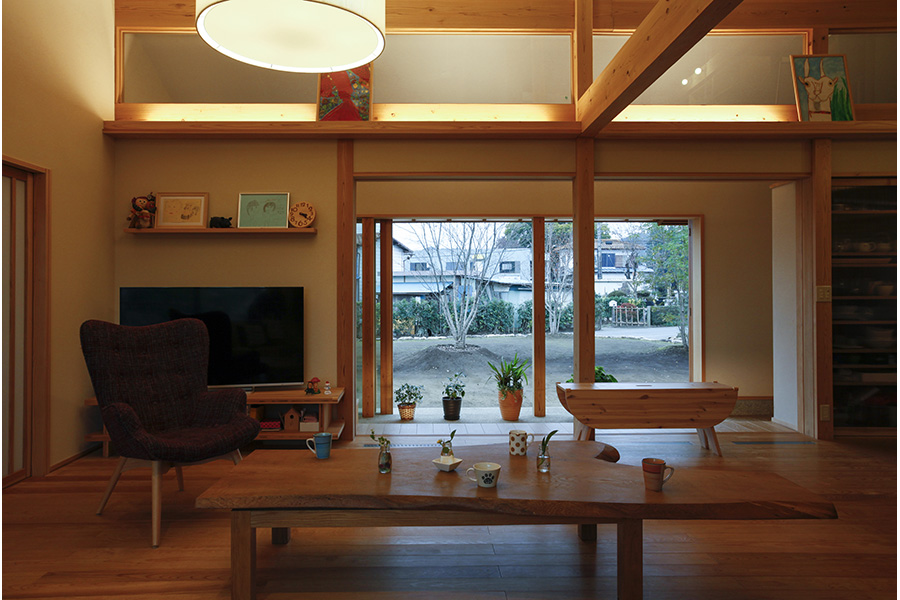 玄関を挟んで大屋根側が子世代、平屋側が親世代に分かれている二世帯のお住まい。リビングダイニングを中心に、家族の気配を感じられるような間取りになりました。外観は屋根が3つ重なり、美しく落ち着いた佇まいになっています。