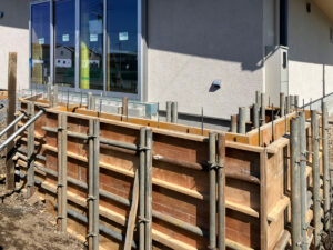 土間コン工事が始まり、一部土留コン用の型枠を組上げました