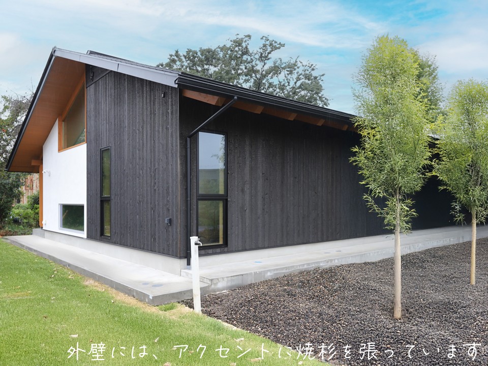 *外壁の一部に、アクセントとなる焼き杉を張りました。