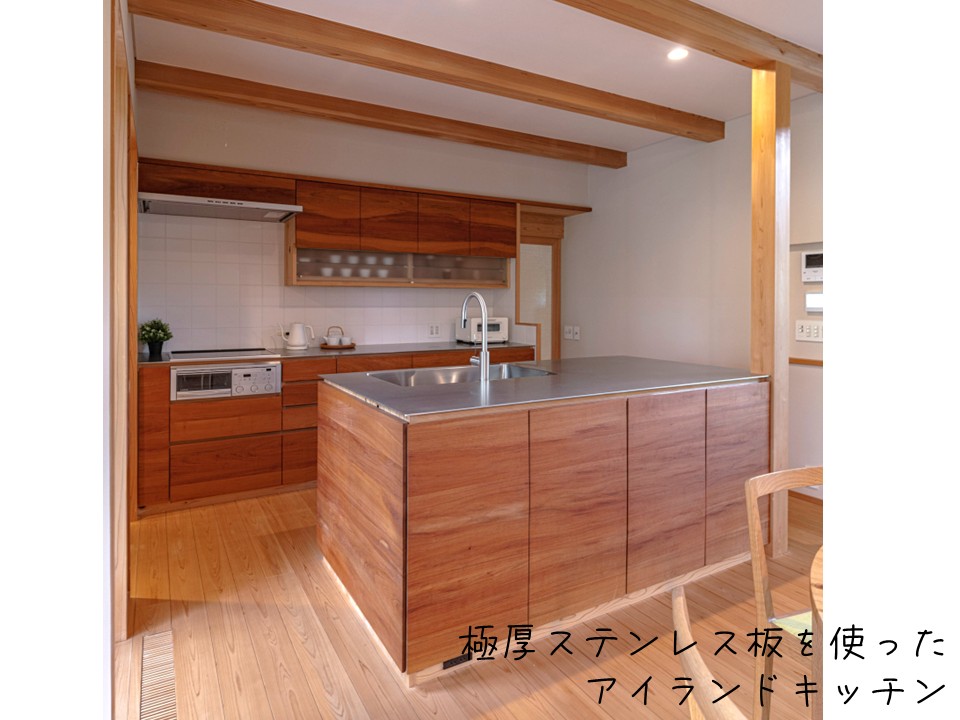 *長さ約5mのステンレス板をのせた、大工さん造作のキッチン。